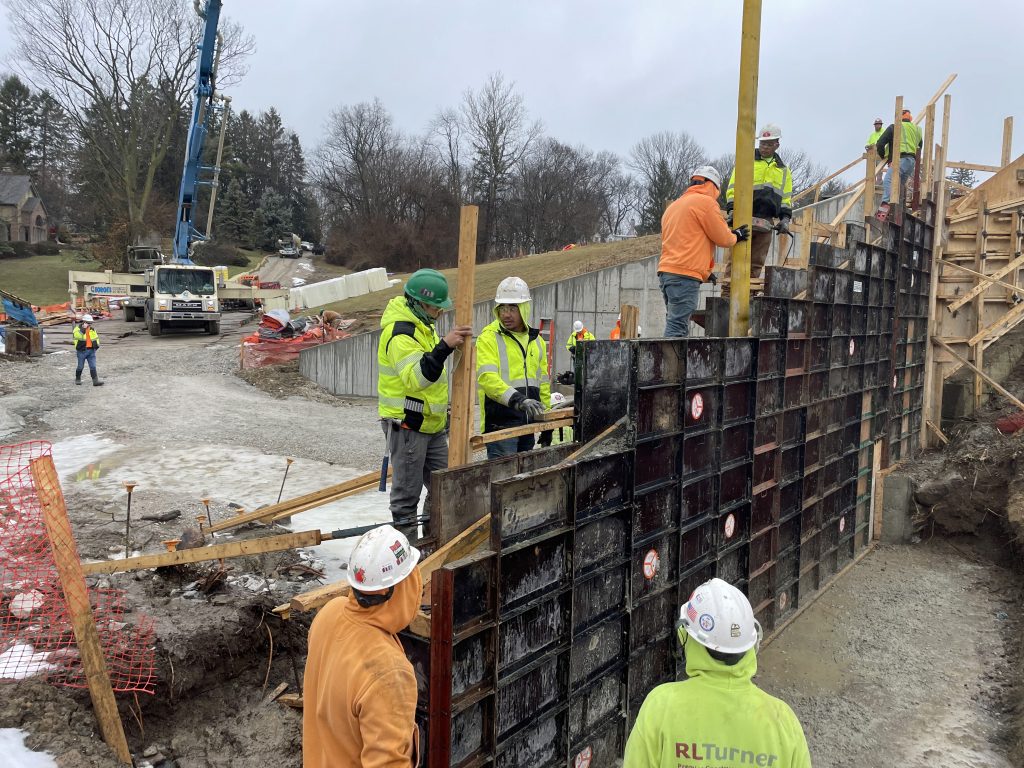 While overseeing the spillway at Traders Point, Kevin Kendall worried about our guys standing on forms while vibrating concrete. The crew needed leverage to move vibrators, but he wondered if there was a better way. Making stiff backs longer and attaching a 2×4 on the side that doesn’t have a walkway proved to be a viable solution to gaining leverage while guarding against falls.